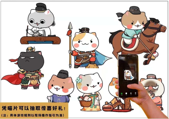 在參與欲旺盛的觀眾看來(lái),沒有互動(dòng)活動(dòng)的展覽是沒有靈魂的。為此,這次特展設(shè)置了三大互動(dòng)活動(dòng)。線上“尋找大唐喵”的游戲,可以通過H5掃一掃,重返大唐,尋找身邊大唐喵的痕跡;線下抓娃娃游戲,各款萌喵等你帶回家;夢(mèng)幻色彩濃厚的長(zhǎng)安市集,帶你感受大唐集市的繁榮,看到喜歡的東西還可以肆意買買買!三大活動(dòng)線上線下相結(jié)合,最大限度增強(qiáng)人們參與的積極性。