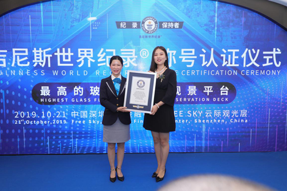 開幕式現(xiàn)場還舉行了吉尼斯世界紀錄授牌儀式,F(xiàn)ree Sky云際觀光層懸空玻璃觀景臺成功挑戰(zhàn)吉尼斯世界記錄?榮譽,榮膺“最高的玻璃底懸挑觀景平臺”稱號。