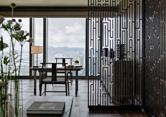 傳統(tǒng)文人雅士的家,有安靜的房間,更要有綠意的庭院。因此,深圳柏悅酒店也力求打造“城市空中庭院”。Yabu Pushelberg敏銳地覺察到這一點,在深圳柏悅酒店的室內(nèi)設(shè)計中結(jié)合了大量的山、水等自然元素,讓人感覺雖然在市中心,但是并沒有喧囂塵世的感覺——一墻之隔,這里就是人們獲得解脫與休憩的地方,正如同自己的“家”一樣:身后,是嘈雜與浮躁,但只要一邁進這道大門,就感受到“庭院深深深幾許”的愜意。