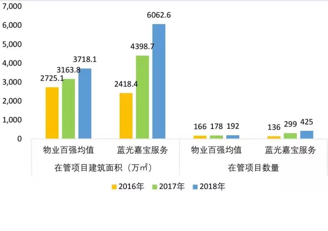 ▲物業(yè)百?gòu)?qiáng)與藍(lán)光嘉寶服務(wù)項(xiàng)目在管面積及數(shù)量對(duì)比