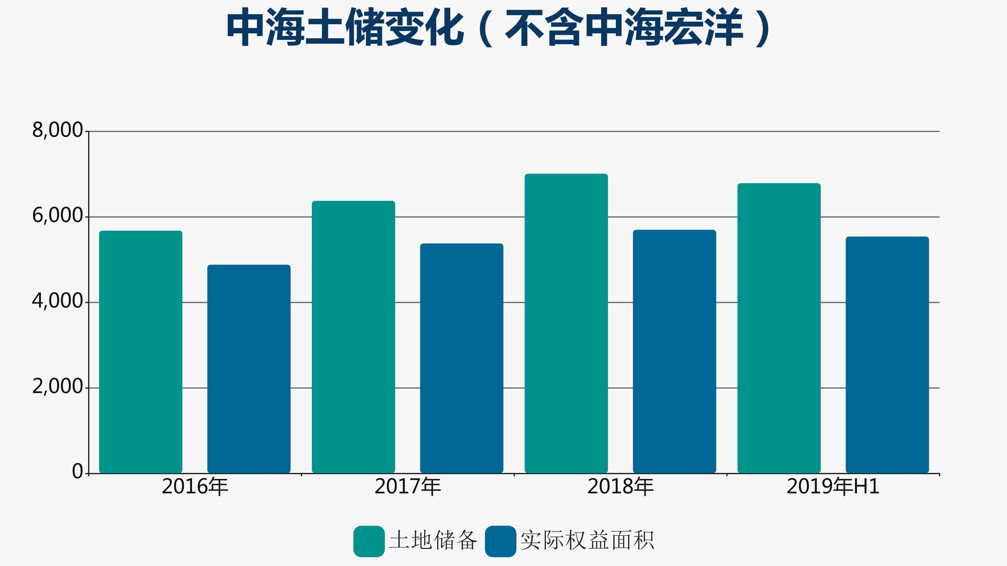 因此,盡管積極納儲(chǔ)近三年,中海每年應(yīng)占土地面積并沒(méi)有出現(xiàn)太大波動(dòng)。2017年至2019年上半年,實(shí)際權(quán)益土地儲(chǔ)備分別為5378萬(wàn)平方米、5697萬(wàn)平方米以及5540萬(wàn)平方米。