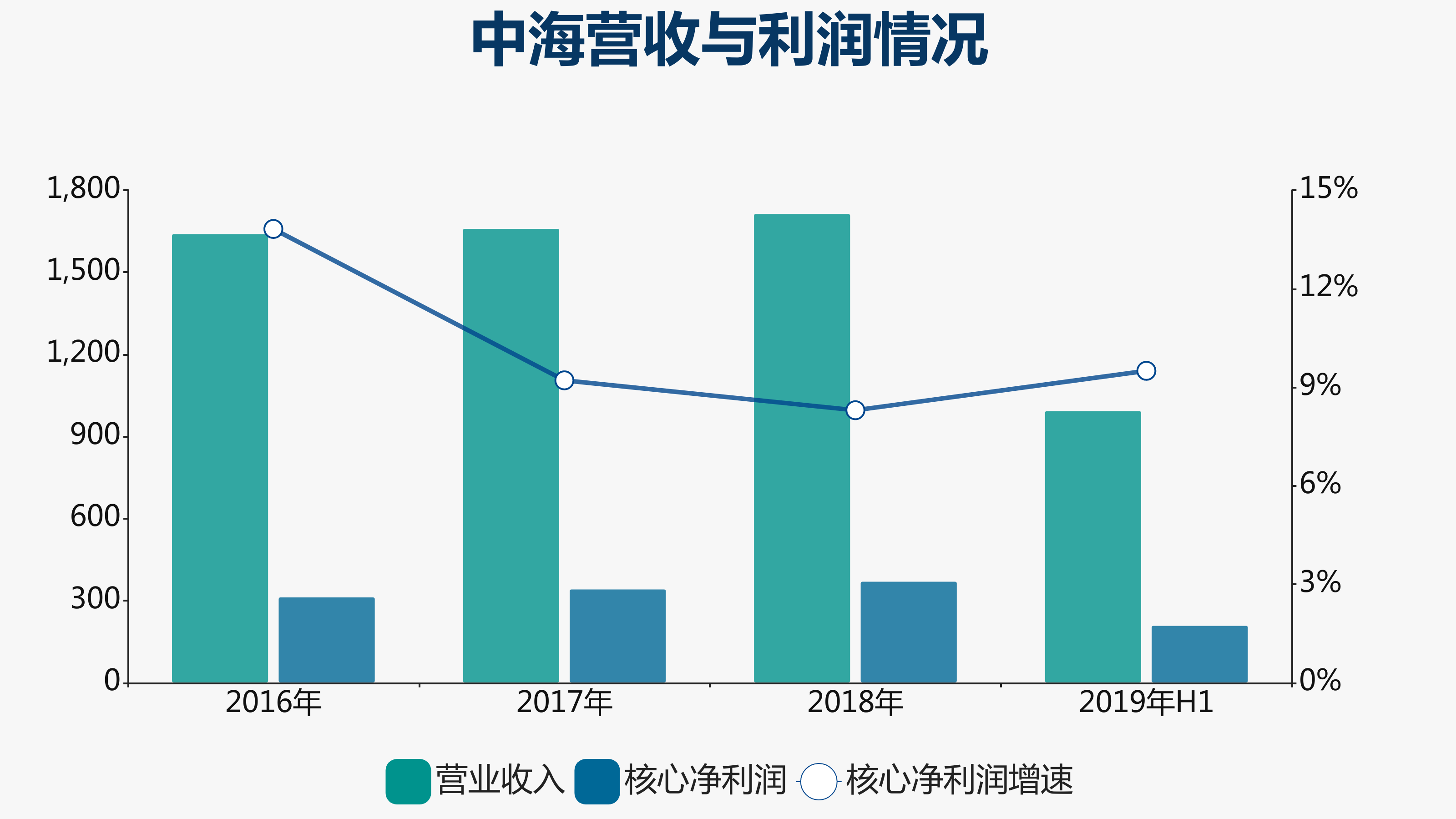 規(guī)模是要的,利潤(rùn)當(dāng)然也要。顏建國(guó)每一次業(yè)績(jī)會(huì)都不厭其煩地重復(fù)中海要“注重規(guī)模與效益的平衡”。然而事實(shí)是,過(guò)去兩年間,中海核心凈利潤(rùn)增速已經(jīng)放緩至9.21%、8.3%,至2019年上半年,核心凈利潤(rùn)同比增長(zhǎng)9.5%,告別兩位數(shù)時(shí)代已有一段時(shí)間。