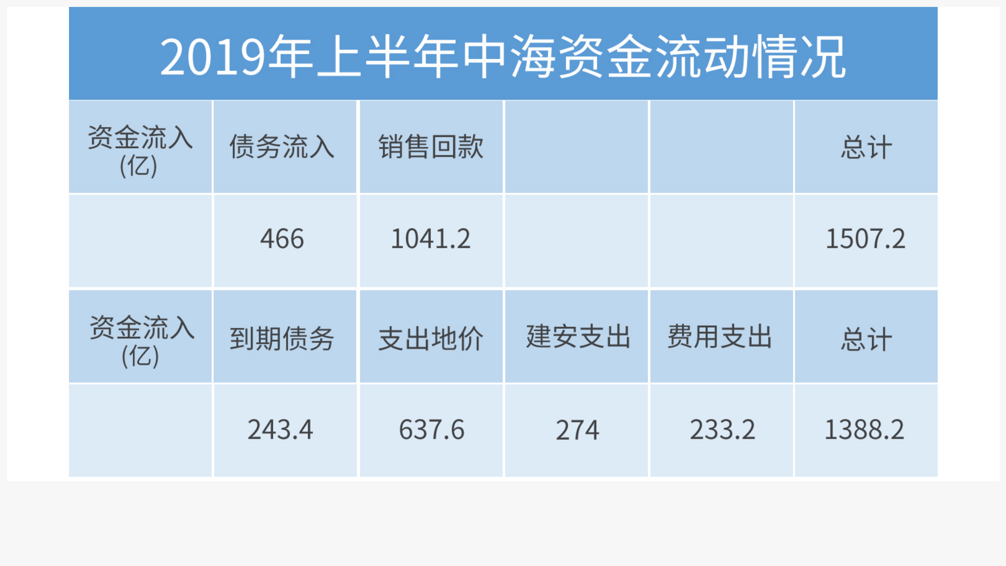 2019年上半年,中海銷售回款錄得1041.2億港元,因年初300億銀團(tuán)貸款,上半年融資流入達(dá)到466億港元,共計(jì)流入資金約為1507.2億港元。