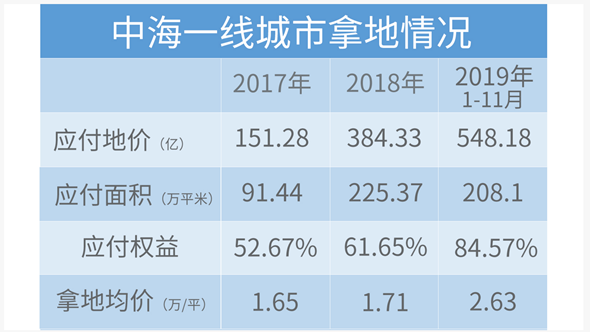 2019年,中海繼續(xù)加大在一線城市的投入,前11月共斥資548.2億元,占總拿地金額比例超過(guò)50%,新增15宗地塊,應(yīng)占樓面面積208.1萬(wàn)平方米,土地權(quán)益也從2017年的52.67%上升至占84.57%,顯示出中海漸漸傾向于獨(dú)立開發(fā)。