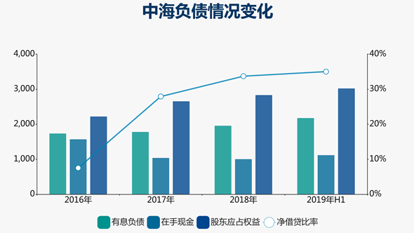 但硬幣是有兩面的,2017年驟然加大土地支出,使得中海當(dāng)年在手現(xiàn)金由2016年末的1571.6億港元下滑至1040.5億港元,并導(dǎo)致凈借貸比率由7.5%上漲至27.9%;此后又因有息負(fù)債持續(xù)增加,至2019年三季度,這個(gè)指標(biāo)已經(jīng)上漲至39%。