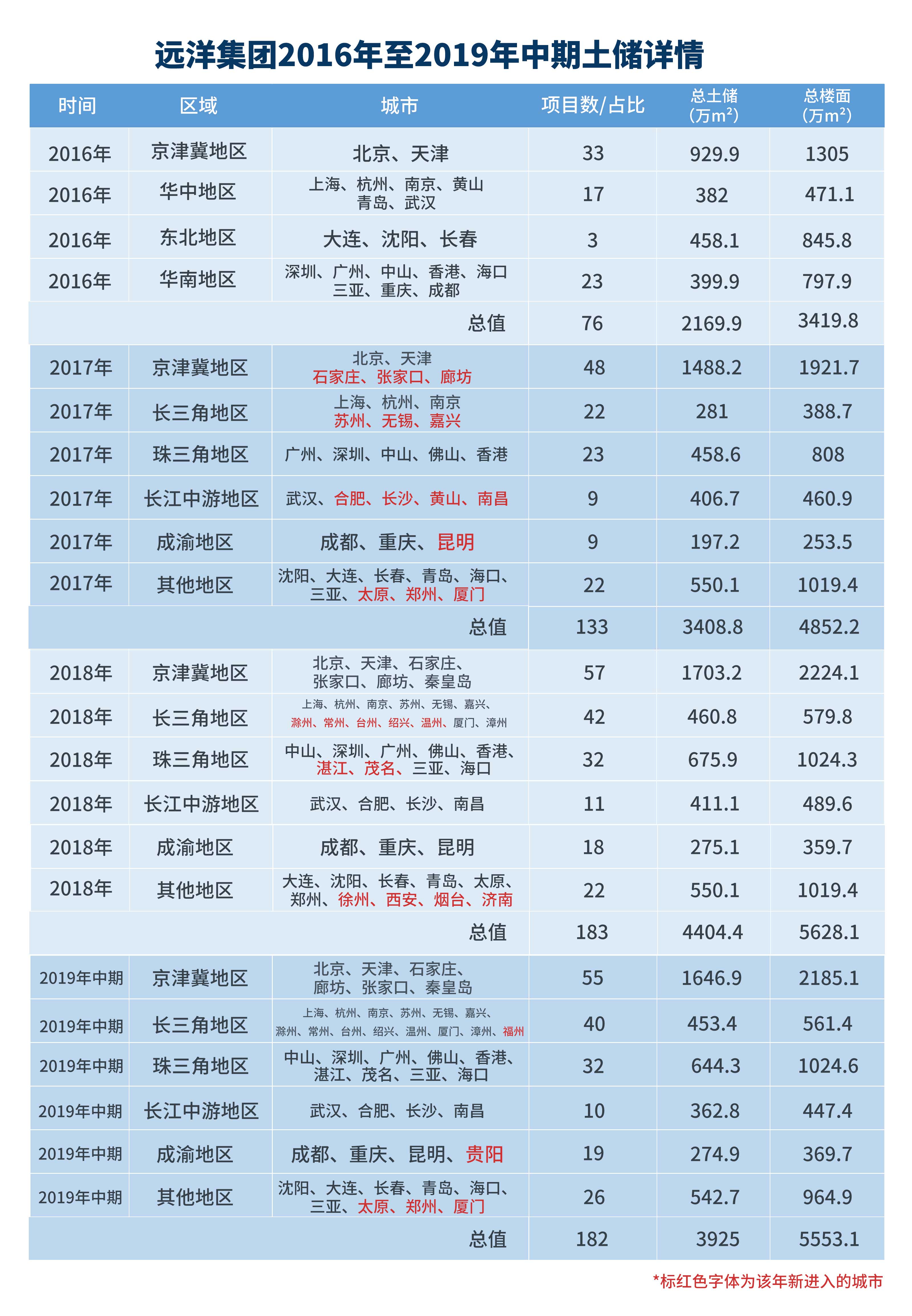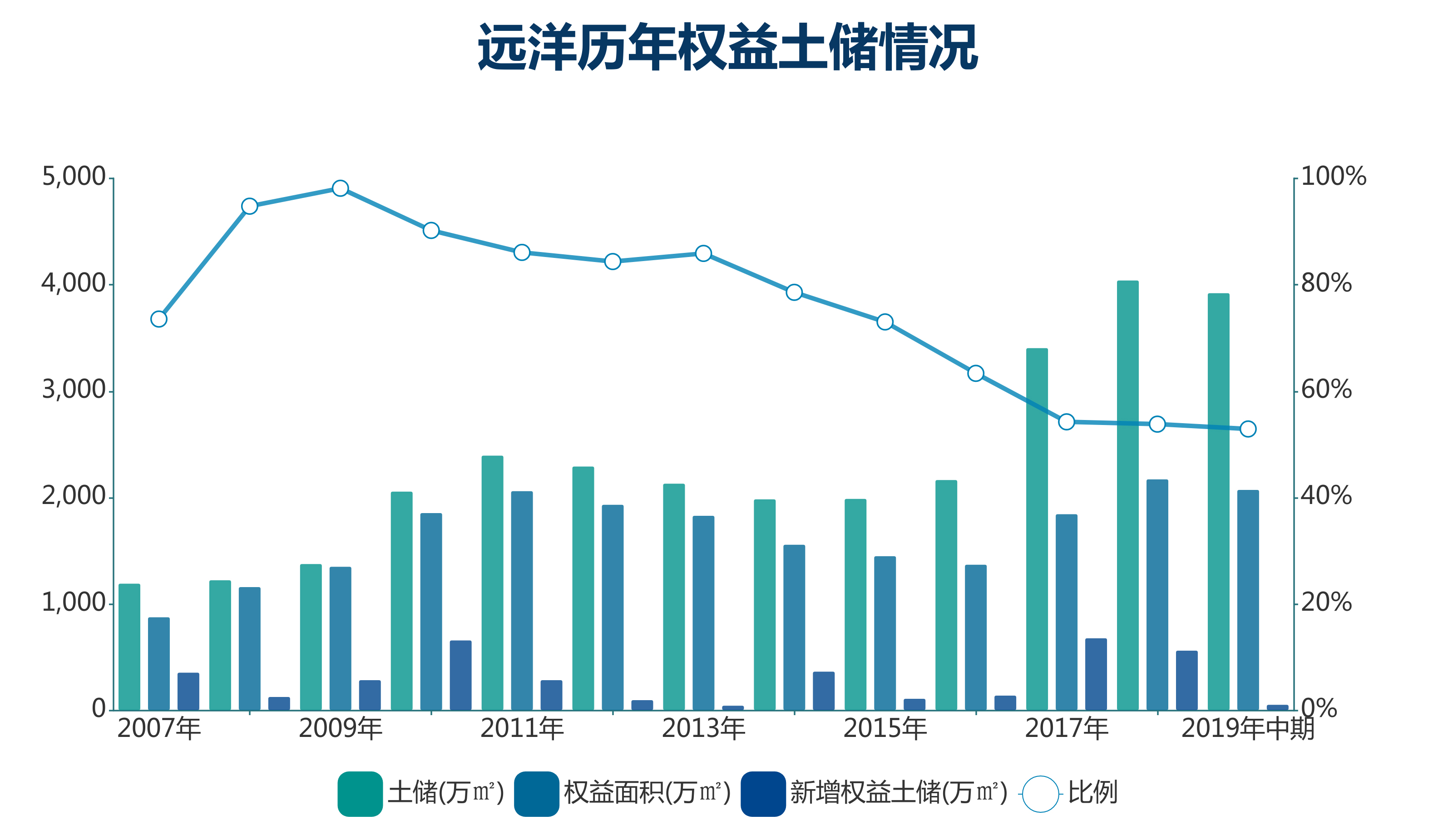 2019年中報顯示,遠洋共購入6宗地塊和1個成熟項目,總樓面面積102.6萬平方米,權(quán)益面積58.1萬平方米,平均購入成本每平方米5500元。