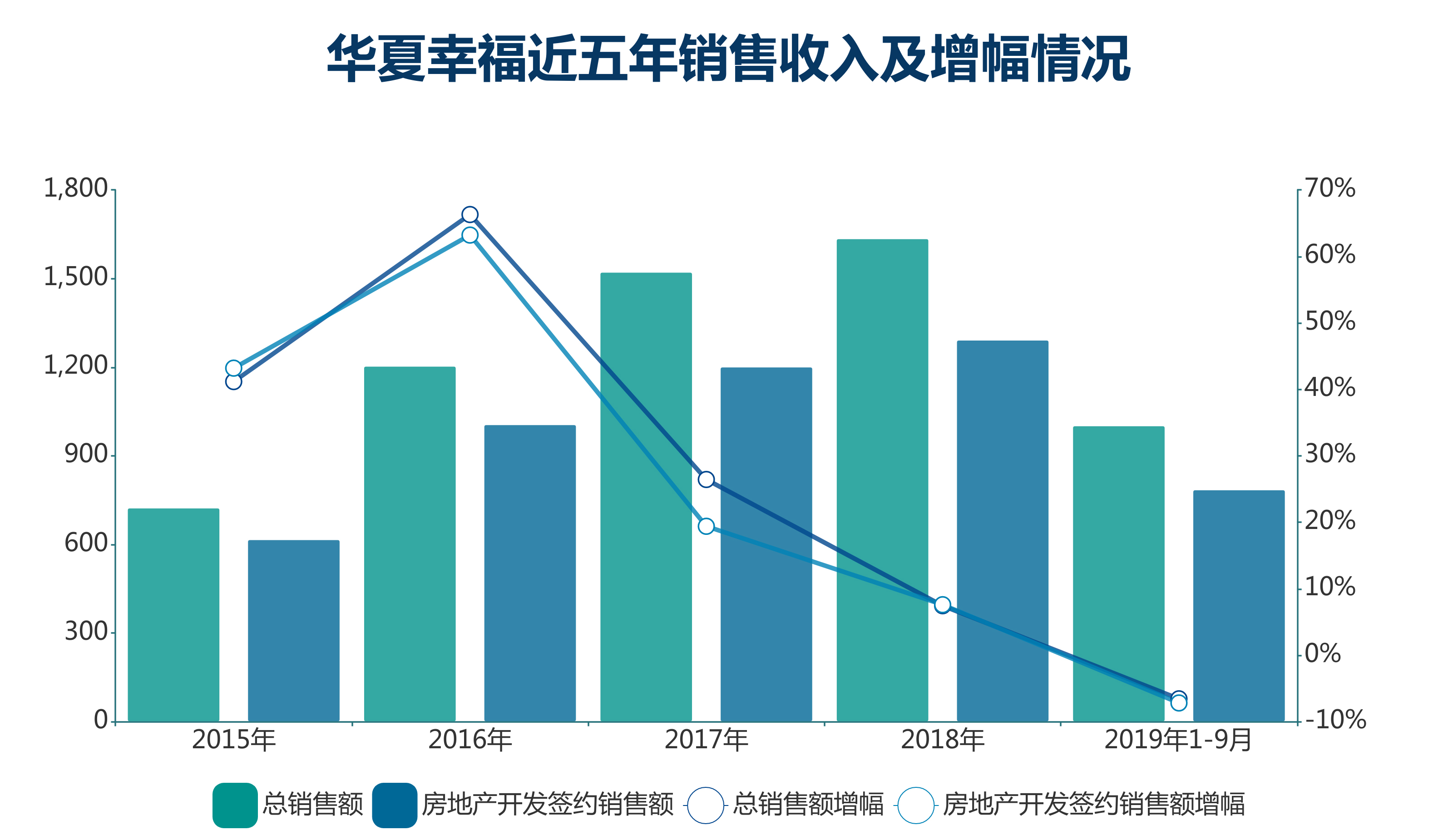 數(shù)據(jù)顯示,2019年上半年,華夏幸福錄得簽約銷售額640.65億元,較2018年同期下滑20.37%。其中,房地產(chǎn)開發(fā)簽約銷售額錄得478.7億元,同比減少26.65%。第三季度,住宅銷售額降幅有所收窄,但仍舊沒有扭轉(zhuǎn)向下的趨勢。