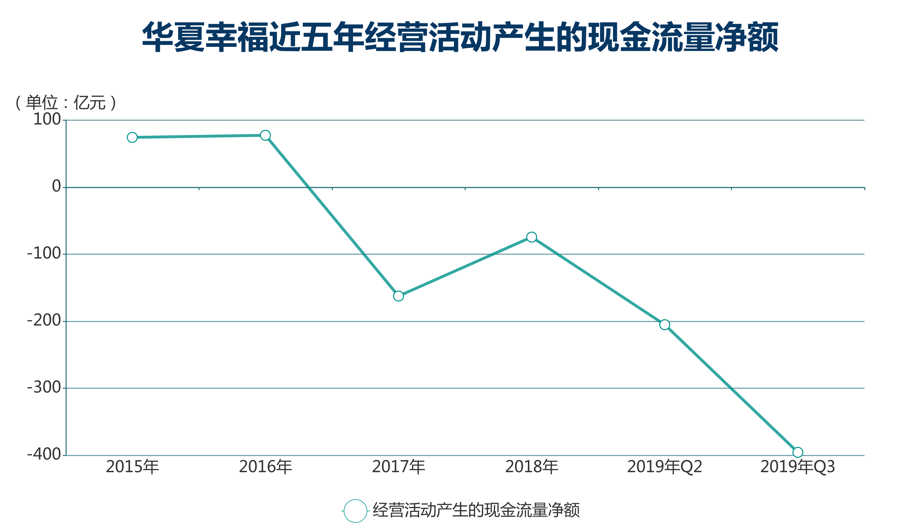 數(shù)據(jù)顯示,2017年,華夏幸福經(jīng)營活動產(chǎn)生的現(xiàn)金流量凈額-162.28億元,首次錄得負值;隨后的2018年,這一數(shù)值為-154.54億元。2019年上半年,錄得經(jīng)營活動產(chǎn)生的現(xiàn)金流量凈額為-205.01億元,第三季度末為-395.54億元,創(chuàng)下歷史新低。