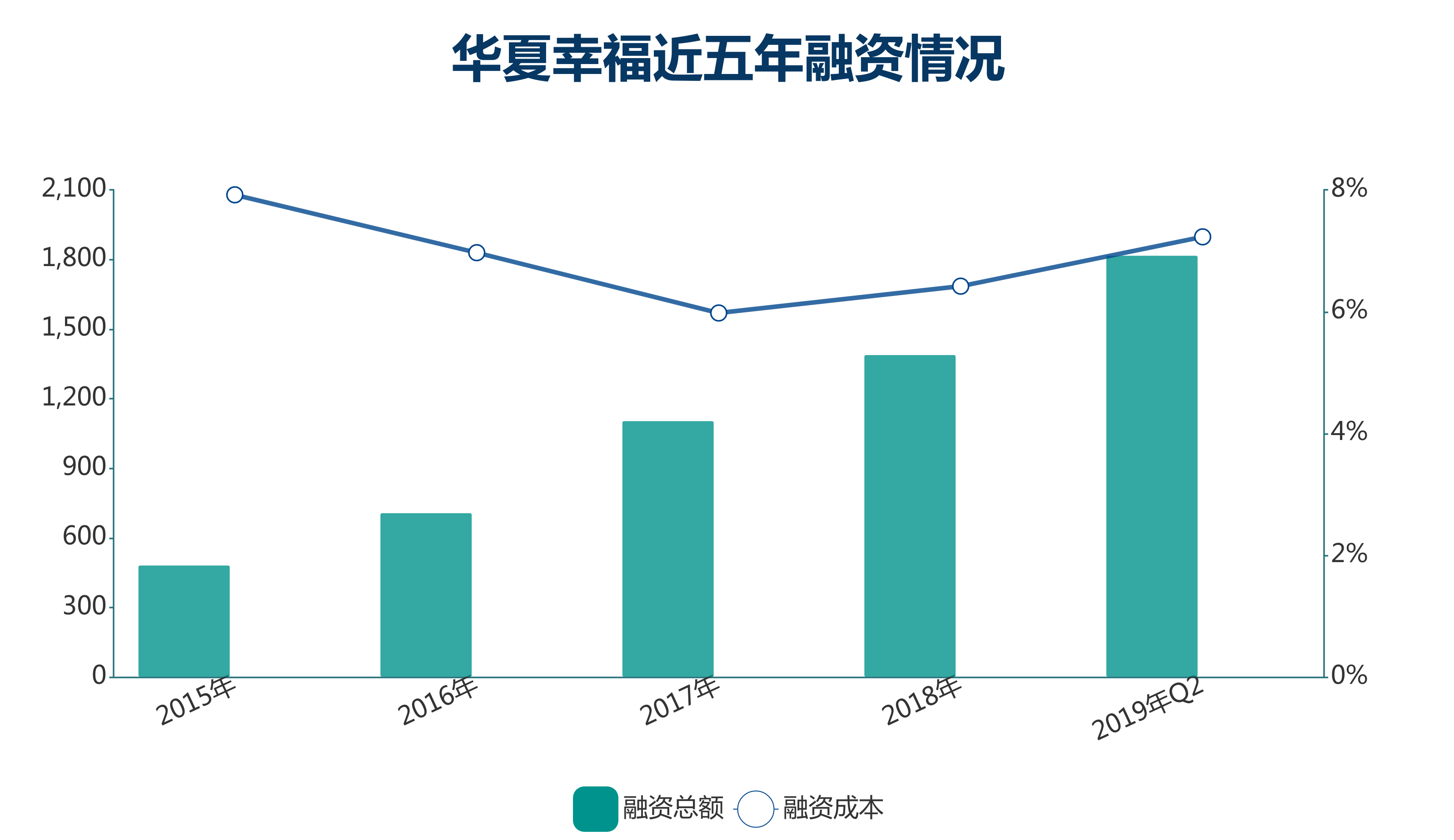 數(shù)據(jù)顯示,上半年華夏幸福銀行貸款平均利息成本6.41%,債券及債務(wù)融資工具平均成本為6.87%,信托、資管等其他融資平均利息成本8.60%。綜合來看,融資加權(quán)平均成本為7.23%,較2018年年末的6.42%上升0.81個百分點,較2017年末的5.98%上升1.25個百分點。