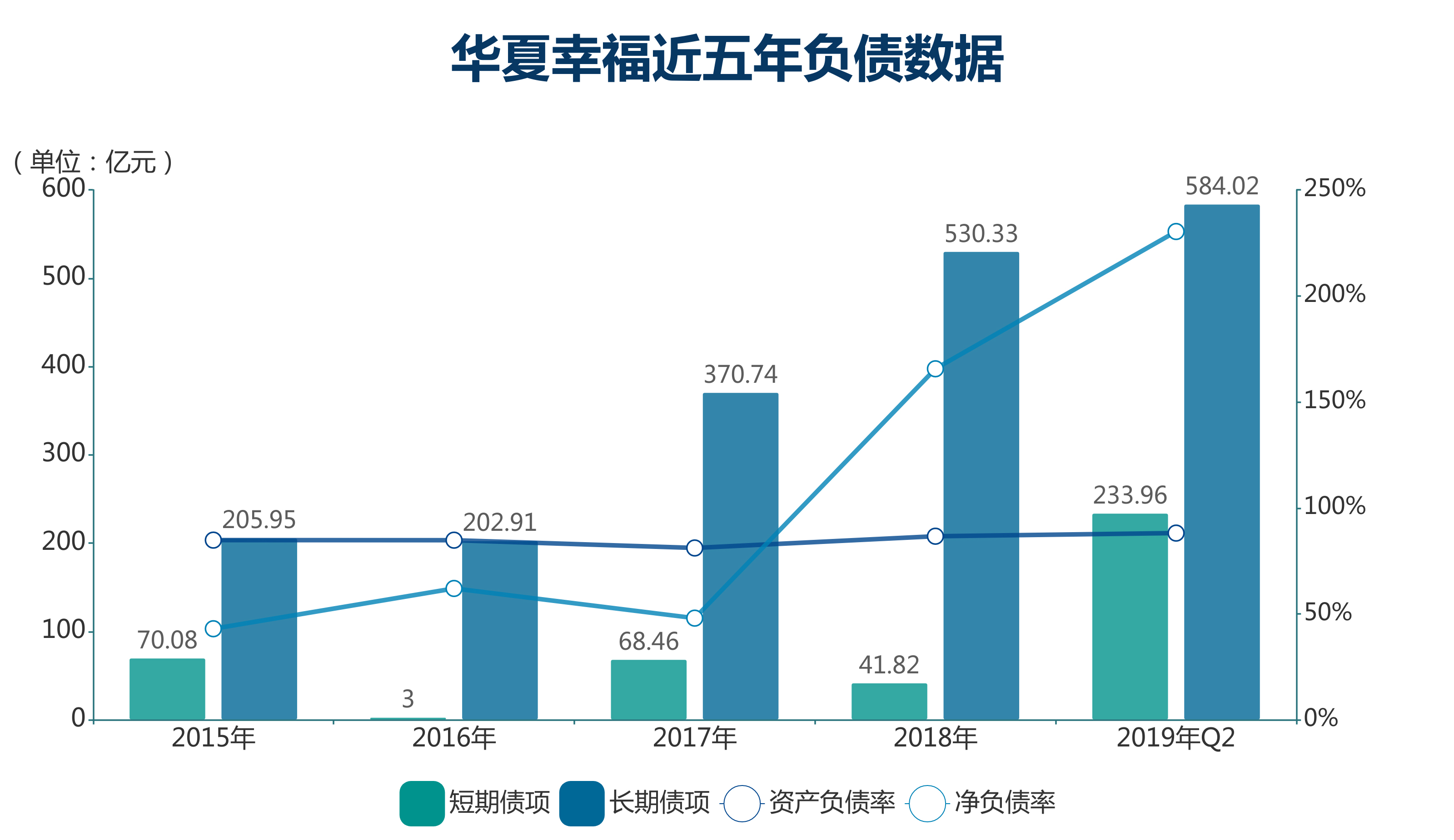 2019年上半年,華夏幸福短期債務(wù)較2018年末41.82億元上升459.45%至233.96億元,同期資產(chǎn)負債率上升至88.12%,凈負債率上升了64.76個百分點至230.39%。