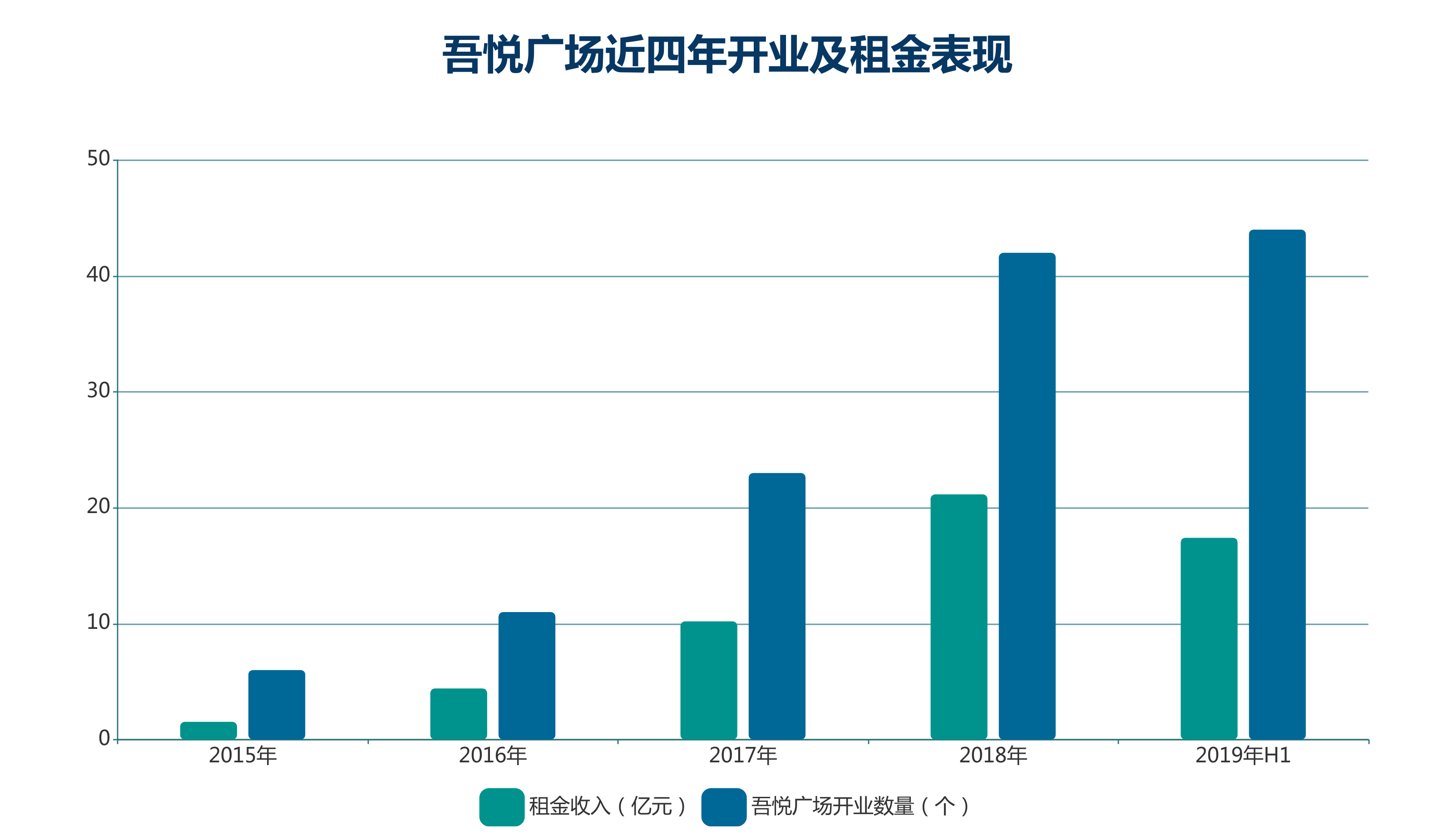 截至2019年上半年,新城在全國布局了116個(gè)吾悅廣場,其中開業(yè)44個(gè),期內(nèi)產(chǎn)生租金收入17.41億元,而據(jù)新城預(yù)計(jì)2019年全年累計(jì)開業(yè)的吾悅廣場將達(dá)到64座。