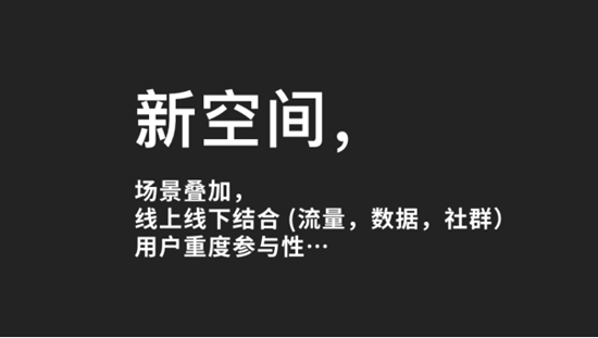 今天的空間已慢慢變成一種載體,這個(gè)載體的內(nèi)容逐漸大于該形式。內(nèi)容反而是更加吸引人,今天是一個(gè)“內(nèi)容為王”的時(shí)代,空間只是一個(gè)載體。新空間有一個(gè)十分重要的特征:新空間一定是場(chǎng)景疊加的。只有這樣最大化的場(chǎng)景疊加才有這樣多的流量進(jìn)入到該場(chǎng)景中。