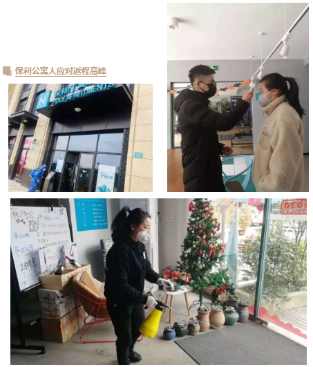 保利公寓所有門店公區(qū)暫時關閉,取消所有租客活動;公寓定時消毒;緊急采購價值數(shù)十萬元的口罩、消毒水,馳援全國門店留店客戶與工作人員;出入人員檢測體溫,所有人員佩戴口罩,公寓上線24小時聯(lián)絡電話;定時定點匯報公寓人員身體狀況,保持與當?shù)卣?、醫(yī)療機構與集團聯(lián)系。