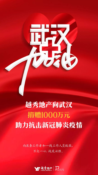 目前正值武漢人民抗擊新冠肺炎的關(guān)鍵時期,越秀地產(chǎn)向堅強(qiáng)奉獻(xiàn)的廣大醫(yī)務(wù)工作者致敬,向奮戰(zhàn)在抗擊疫情一線的各行各業(yè)工作人員致敬!我們將上下一心,眾志成城,踐行國企擔(dān)當(dāng),同全國人民一起共克時艱,打贏這場沒有硝煙的疫情阻擊戰(zhàn)!