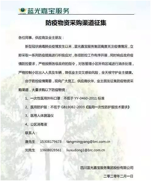 疫情發(fā)生后,藍光嘉寶服務第一時間啟動“應急物資保障機制”,由集團層面集中采買,籌措了包括口罩、消毒液、體溫槍等防疫物資。備貨需求從最初滿足5天用量,提高到滿足至2月底的物資需求,做到早預備、早實施。目前,由于市場上抗疫物資數(shù)量有限,體溫槍仍然存在一定缺口。