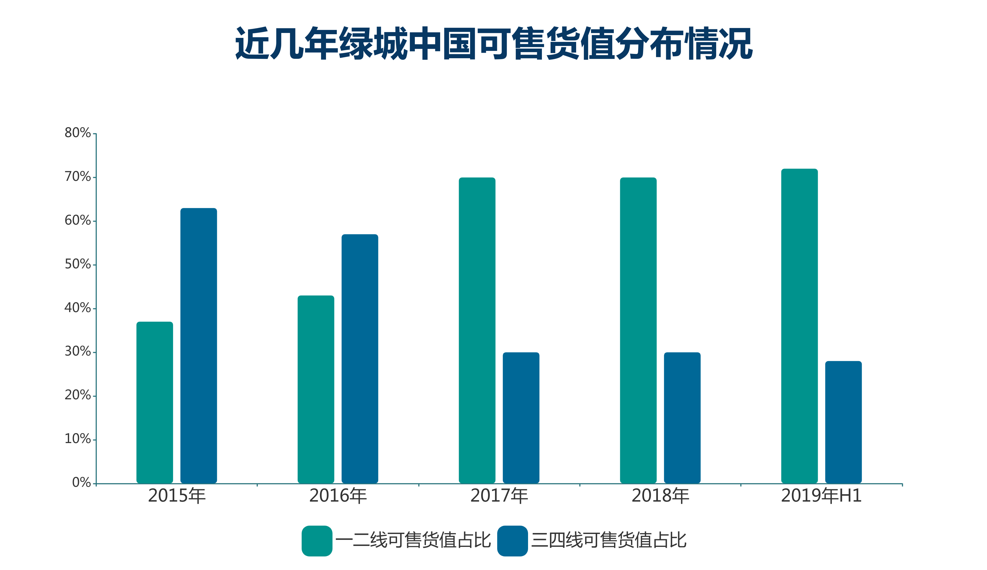 與此同時(shí),在城市布局上,綠城從三四線抽身,重新回到能體現(xiàn)自身產(chǎn)品優(yōu)勢(shì)的一二線。截至2019年中期,綠城一二線可售貨值占比從2015年的37%提升至72%。