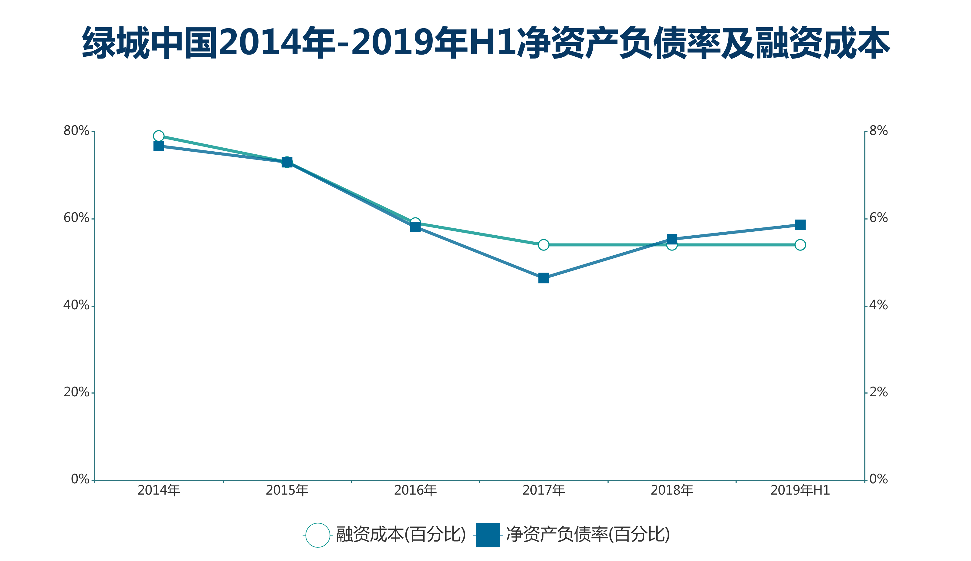 數(shù)據(jù)上看,綠城凈資產(chǎn)負(fù)債率從2014年76.70%降至2017年歷史低點(diǎn)46.40%,平均融資成本從7.9%下降至5.3%。另外,現(xiàn)金短債比也從2014年的0.75回升至2019年上半年的2.68,近三年這一數(shù)值更是連續(xù)三年高于2,牢牢站在可控的安全范圍內(nèi)。