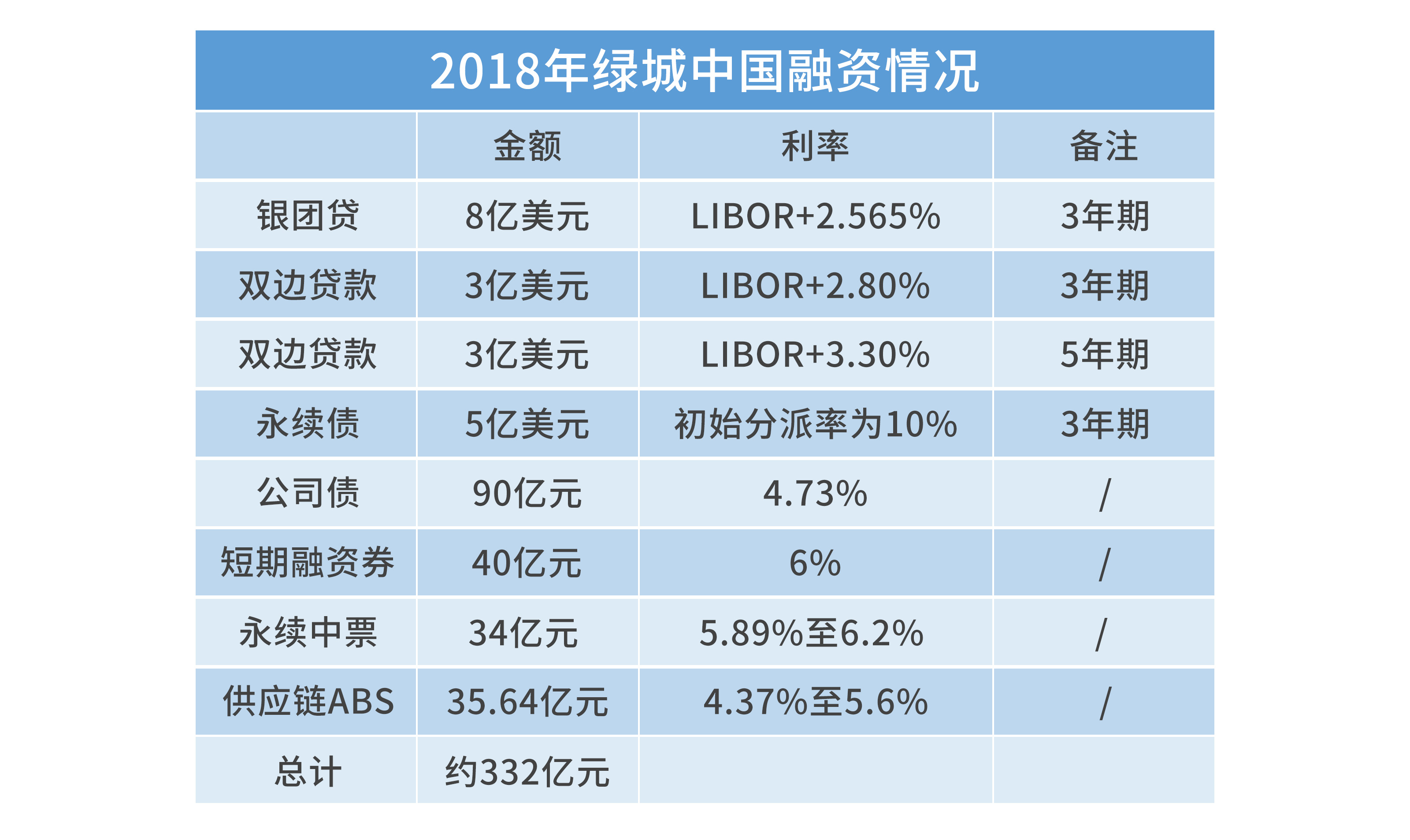 據(jù)觀點(diǎn)新媒體不完全統(tǒng)計(jì),2018年,綠城在境內(nèi)和境外通過(guò)發(fā)債、銀團(tuán)貸、供應(yīng)鏈ABS等多種融資工具共計(jì)新增融資332億元,包括一筆總額90億元的公司債,利率4.73%,兩筆合共6億美元的雙邊貸款,一筆5億美元的永續(xù)債,以及一筆8億美元的銀團(tuán)貸。
