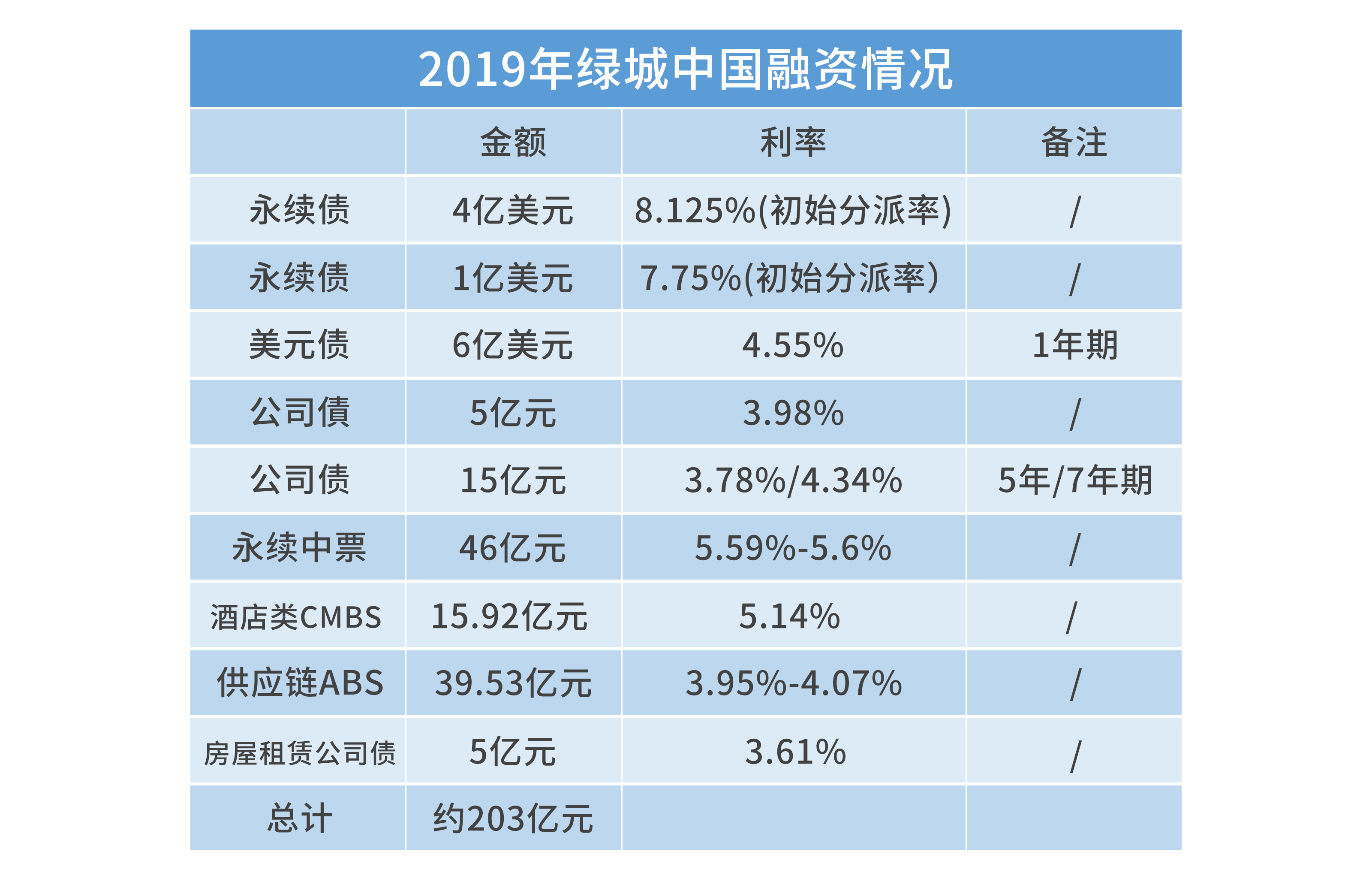 2019年,綠城繼續(xù)馬不停蹄發(fā)債,年內(nèi)先后發(fā)行3筆美元債,合計(jì)11億美元,其中6億美元的1年期美元債利率僅為4.55%。在境內(nèi),綠城共發(fā)行20億公司債,46億永續(xù)中票、酒店類CMBS、供應(yīng)鏈ABS以及房屋租賃公司債。據(jù)不完全統(tǒng)計(jì),年內(nèi)共融資約203億元。