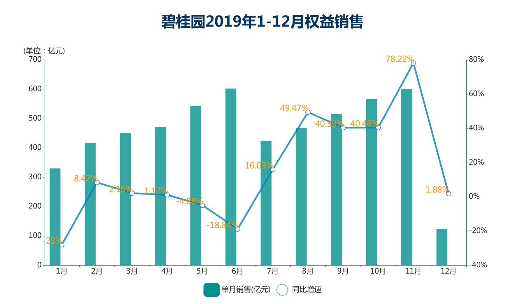 年中之后形勢開始反轉(zhuǎn),單月增速從6月的-18.84%上漲為7月的16.03%,且一路不斷走高,至11月達(dá)到最大增速,單月權(quán)益銷售同比增長78.22%至602億元。在最后一個月,碧桂園如往年慣常,急踩剎車使單月銷售一下回落至123億元。
