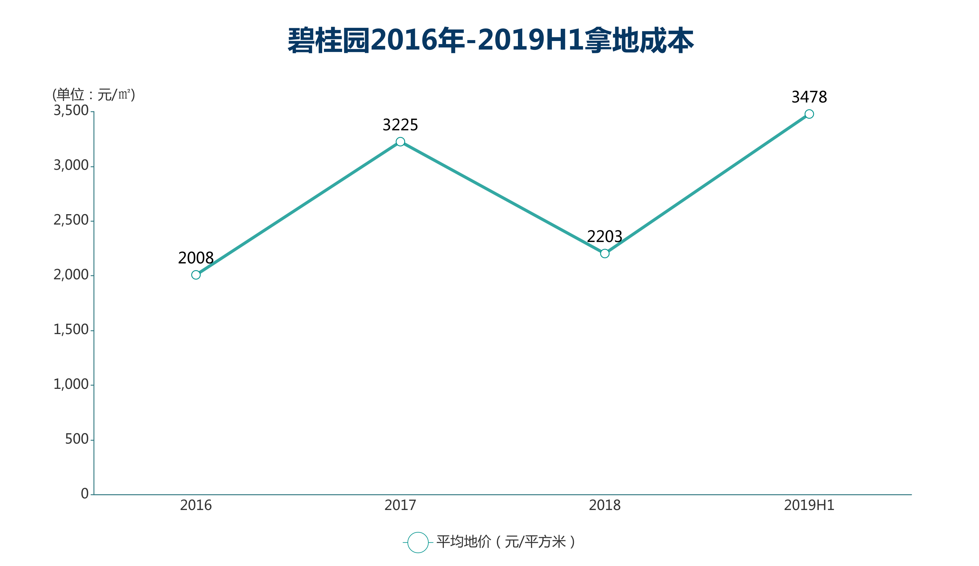 值得注意的是,2019年以來碧桂園拿地成本有所上升。中報顯示,2019年上半年碧桂園拿地權(quán)益總代價1148億元左右,平均權(quán)益地價為3478元/平方米,較2018年2203元/平方米的地價上升超1000元。