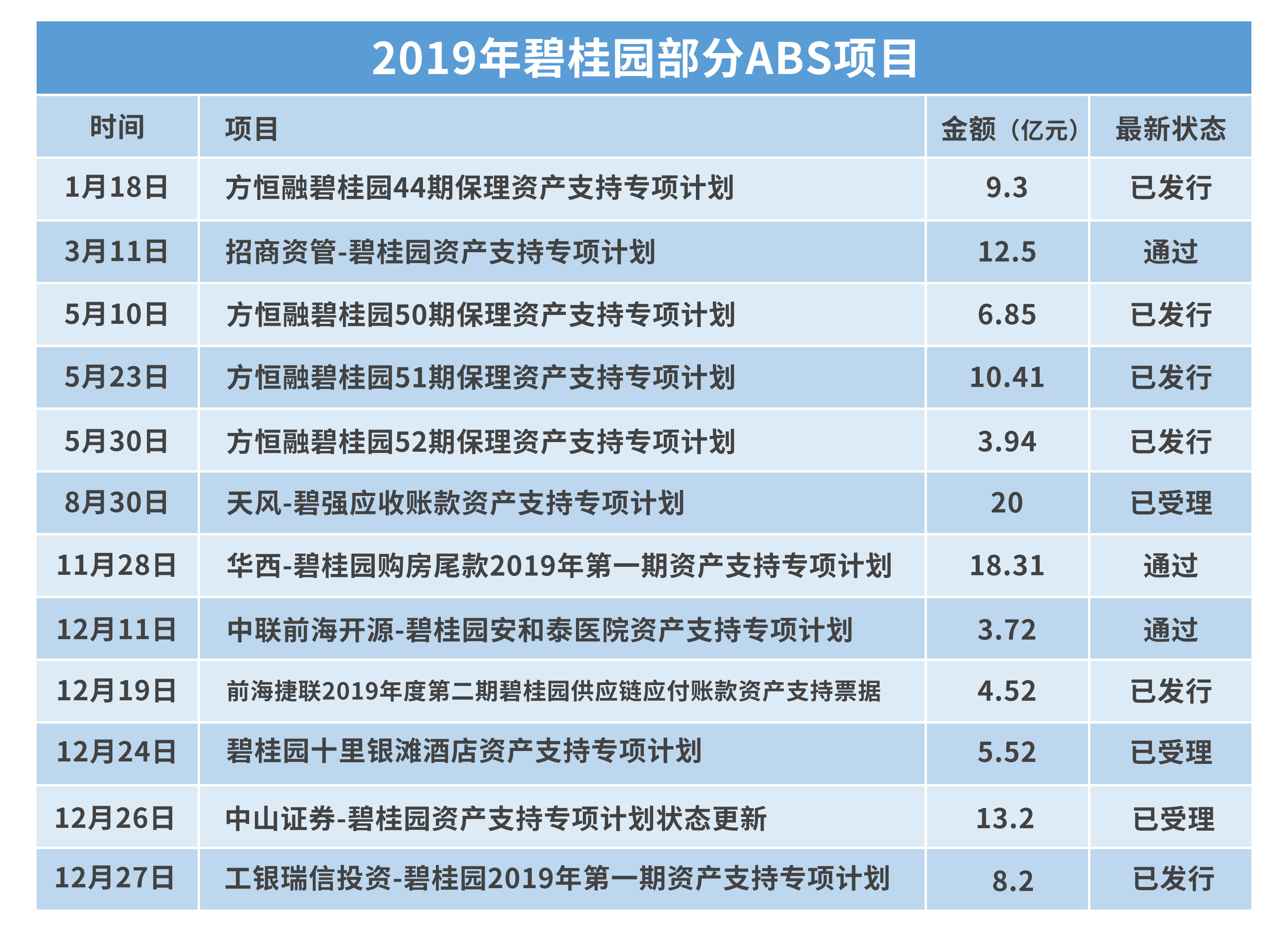 傳統(tǒng)融資渠道收窄之下,碧桂園還將融資需求轉(zhuǎn)向一些受限較少的渠道,如購房尾款A(yù)BS、供應(yīng)鏈ABS等資產(chǎn)證券化產(chǎn)品。據(jù)觀點(diǎn)指數(shù)統(tǒng)計,2019年碧桂園至少有15個ABS項(xiàng)目獲受理、通過或發(fā)行,融資總額超170億元,包括以酒店、醫(yī)院類物業(yè)作為底層資產(chǎn)進(jìn)行融資,如“碧桂園十里銀灘酒店資產(chǎn)支持專項(xiàng)計劃”融資金額5.25億元。