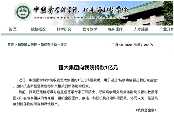 疫情防控和科研攻關(guān),是當(dāng)前抗擊疫情工作的重中之重,需要全社會(huì)各界力量共同參與。記者從中國(guó)醫(yī)學(xué)科學(xué)院官網(wǎng)獲悉,恒大集團(tuán)近日向中國(guó)醫(yī)學(xué)科學(xué)院現(xiàn)金捐贈(zèng)1億元,支持設(shè)立“抗病毒創(chuàng)新藥物研究基金”,用于加快抗擊新冠肺炎相關(guān)創(chuàng)新藥物的研發(fā)。