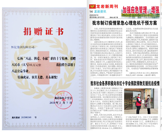 恒億堅(jiān)持踐行企業(yè)社會(huì)責(zé)任,為國家社會(huì)多做貢獻(xiàn),近年來共計(jì)為慈善和公益事業(yè)捐款數(shù)億元。恒億作為龍巖本土企業(yè),在大難面前,更是每次都積極響應(yīng)政府號(hào)召?zèng)_鋒陷陣,投入大量人力、物力、財(cái)力參與應(yīng)急建設(shè)!不僅自身企業(yè)鼓勵(lì)捐款,還呼吁龍巖市房地產(chǎn)業(yè)協(xié)會(huì)其他兄弟單位、社會(huì)各界人士伸出援手,與全國人民攜手共克時(shí)艱,共同抗擊疫情,戰(zhàn)勝這場沒有硝煙的"戰(zhàn)役"!