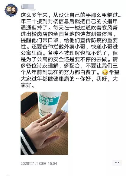 “每天看著有關(guān)疫情的新聞,看著同齡的醫(yī)生護(hù)士在前線救人,我也要每天做好防疫消毒和訪客把關(guān),從上午9點(diǎn)到晚上21點(diǎn)堅(jiān)守崗位。”我就是這棟樓,這些還住在里面的詩友第一層防護(hù)。希望所有的詩友都能放心,我們會一直堅(jiān)守在這里,做好一個(gè)小小的保護(hù)傘。”