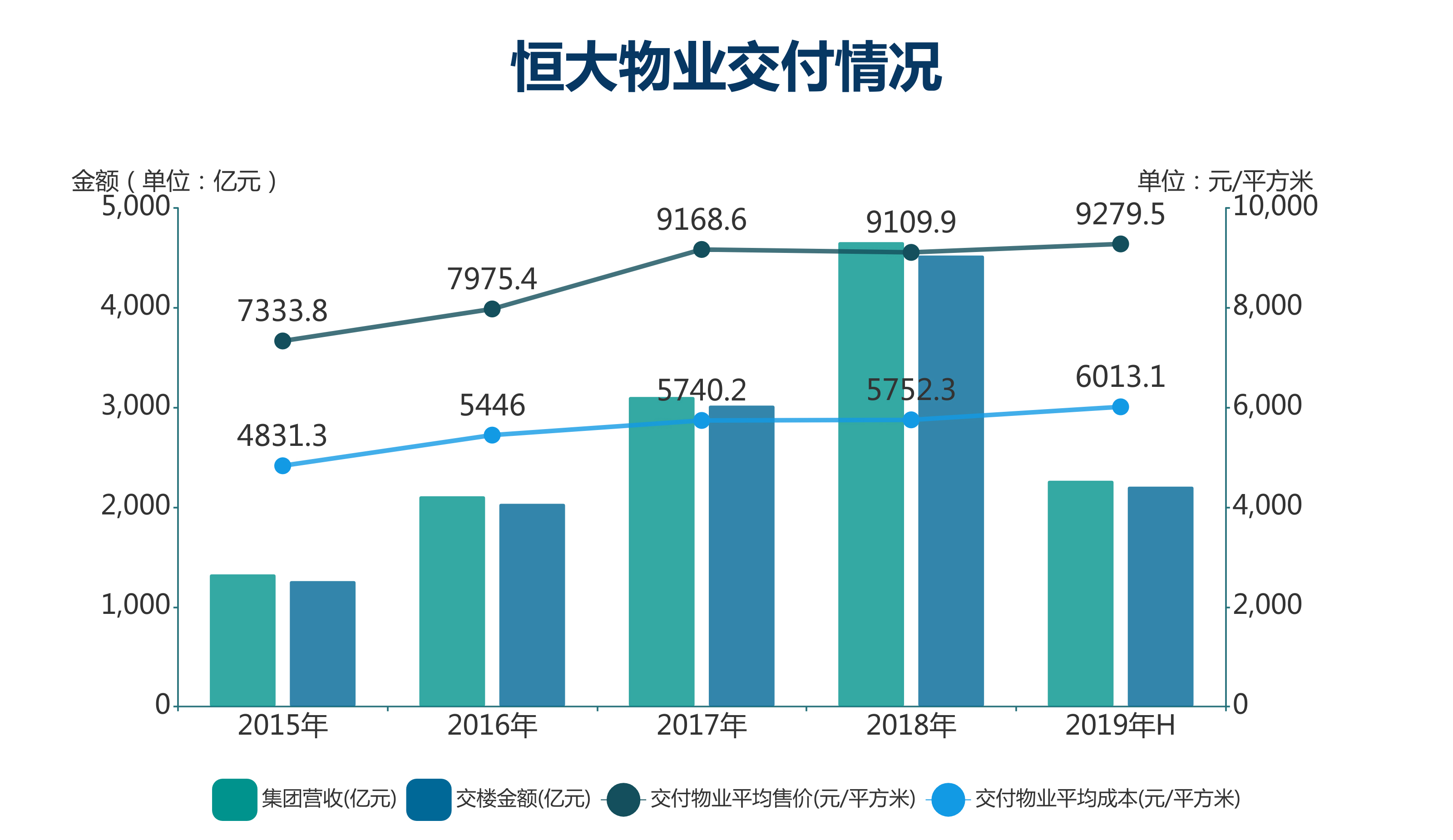 進(jìn)入2019年,資料顯示,恒大在上半年交付了2383.1萬平方米物業(yè),對(duì)應(yīng)的交樓金額是2211.4億元,兩項(xiàng)數(shù)據(jù)都比2018年同期有所下降,當(dāng)年交樓面積則達(dá)到3211.7萬平方米,交樓金額則為2947.6億元。