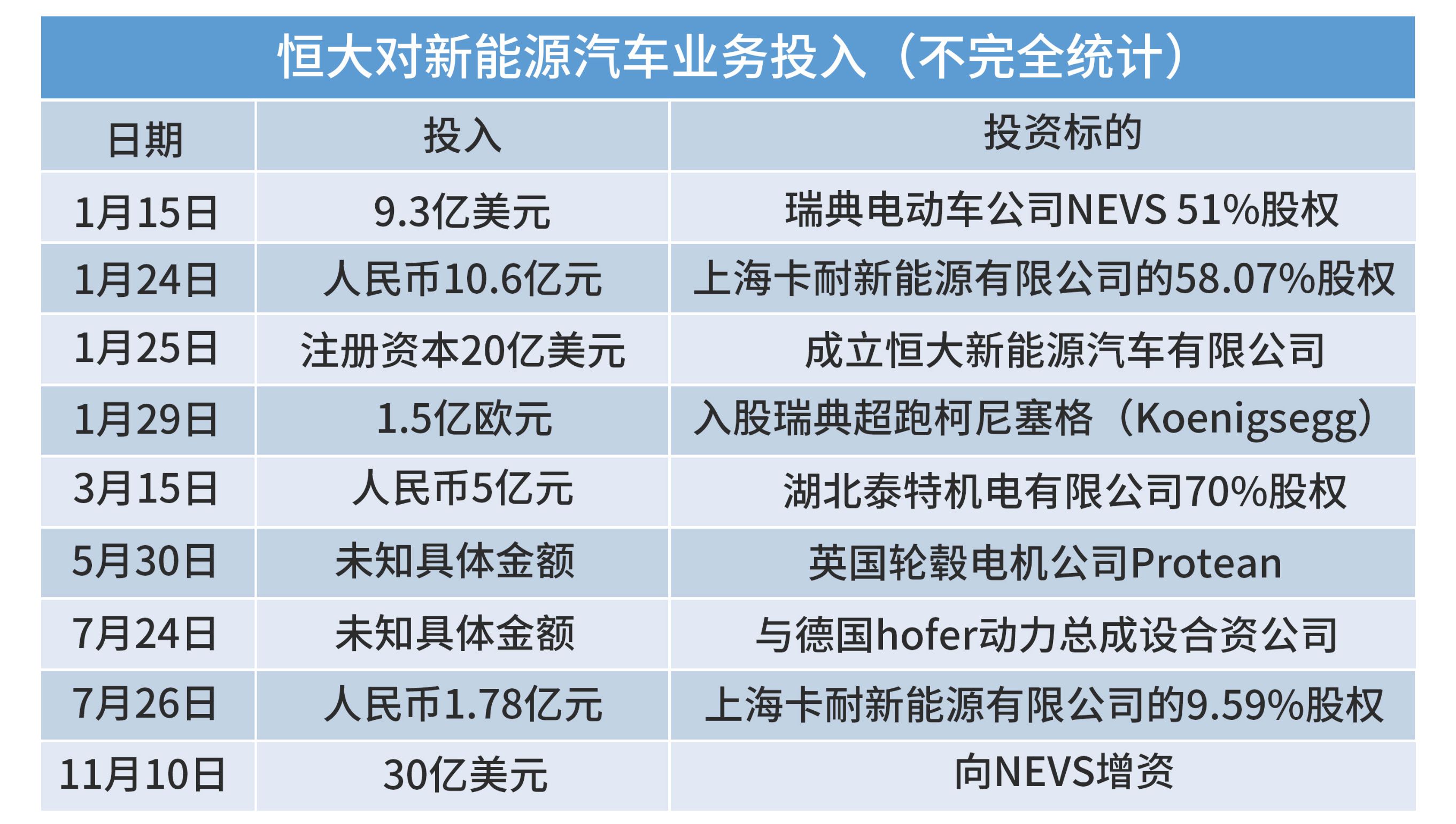 據(jù)恒大披露,包括NEVS、Protean、柯尼塞格的入股等,共花費(fèi)81.7億元;各大汽車基地土地款的支出約30.6億;產(chǎn)房機(jī)械設(shè)備等支出9.8億;研發(fā)費(fèi)用2.6億;并購(gòu)公司收購(gòu)前的借款業(yè)務(wù)16億元。