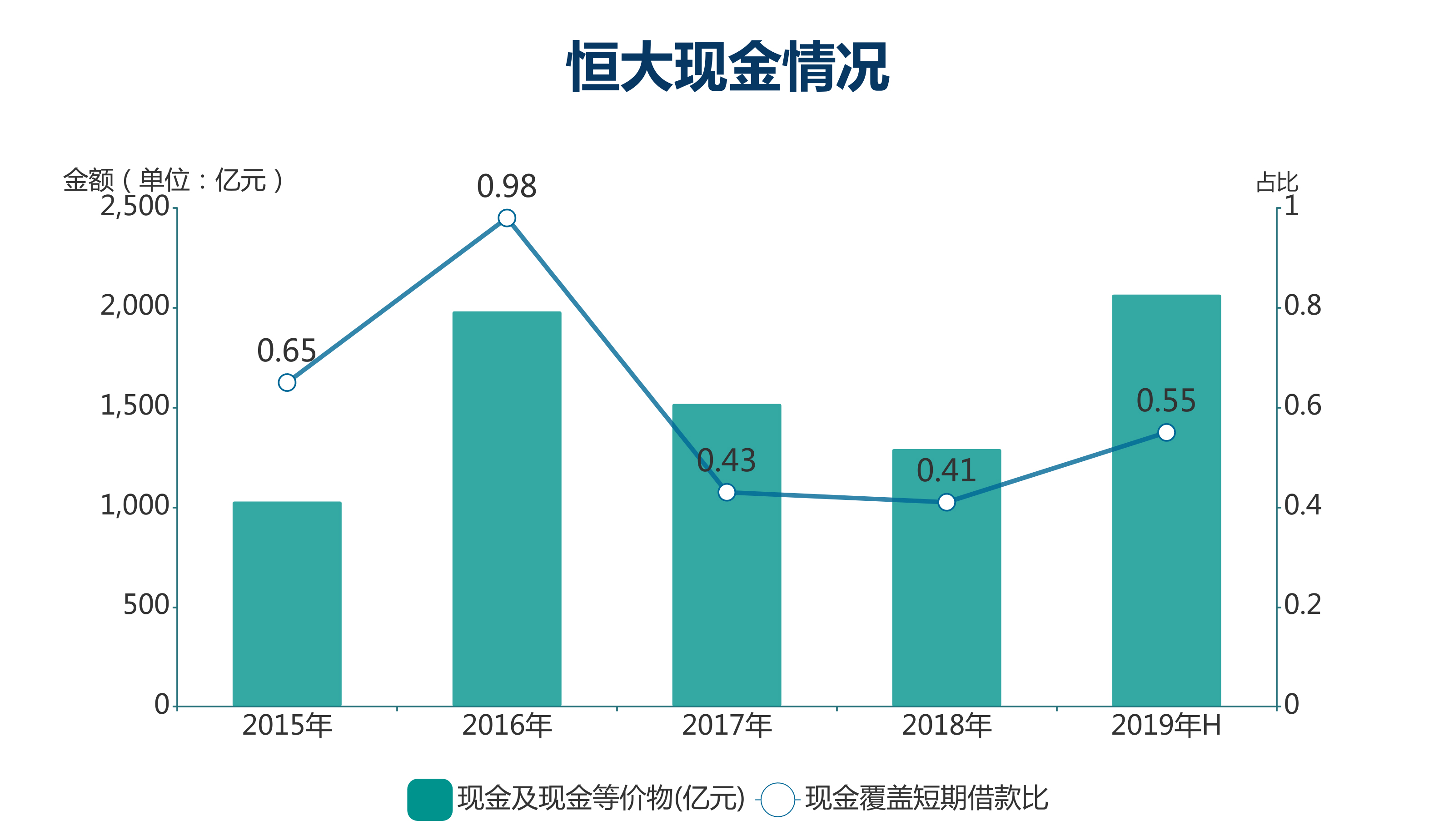 而且恒大目前的流動(dòng)性仍然需要關(guān)注,到2019年6月末,持有現(xiàn)金及現(xiàn)金等價(jià)物錄得2068元,達(dá)到近年來的最高水平。管理層稱:“2019年提高了現(xiàn)金儲(chǔ)備,確保出現(xiàn)風(fēng)險(xiǎn)時(shí)公司要有足夠現(xiàn)金”,但現(xiàn)金需要對(duì)短期負(fù)債進(jìn)行有效覆蓋。