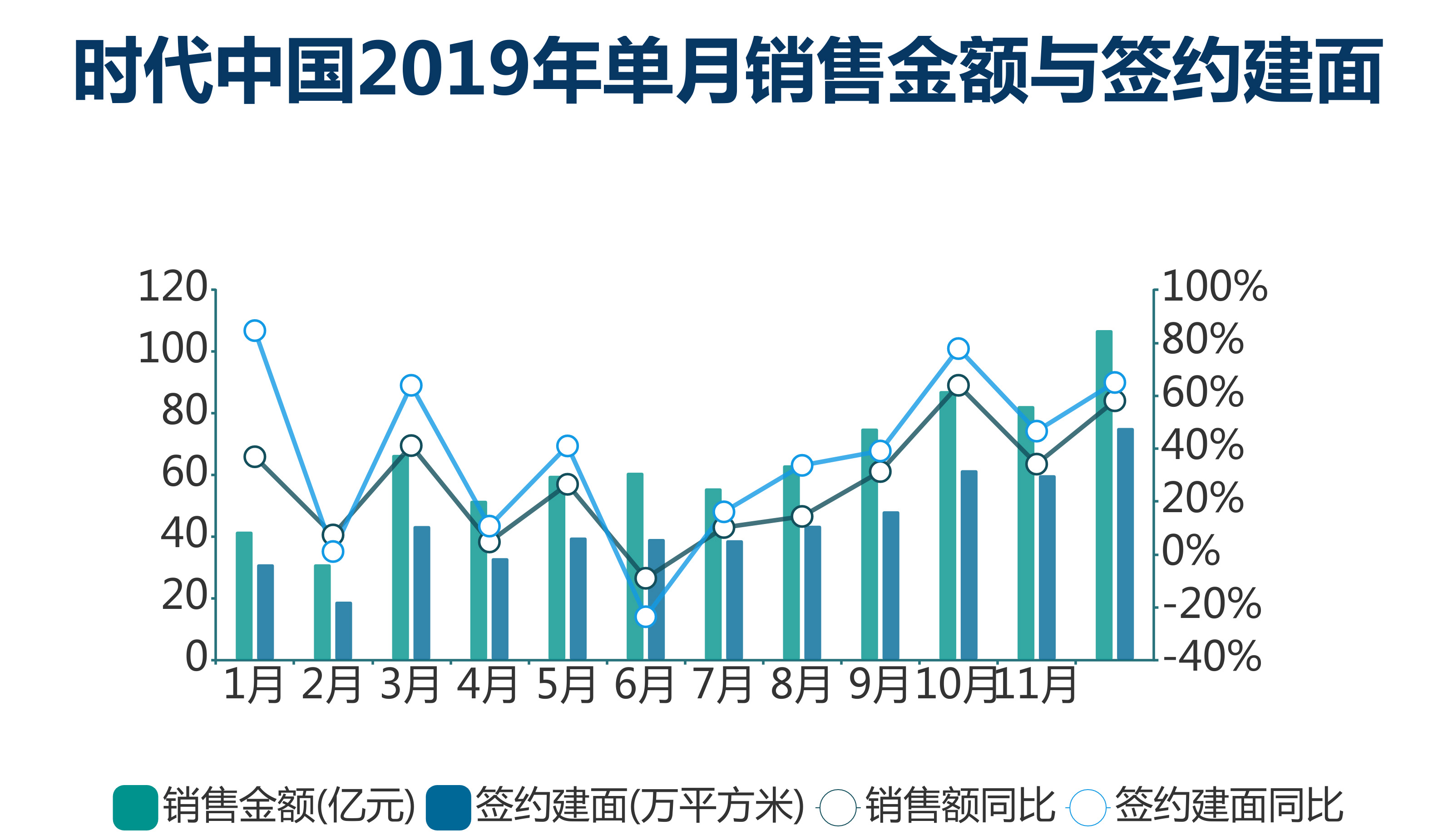 去庫存壓力下,時代中國在最后的四個月繼續(xù)追趕,銷售從9月份開始有所起色,單月實現(xiàn)合同銷售(連合營項目銷售)金額約為75.23億元,同比增長31.3%。