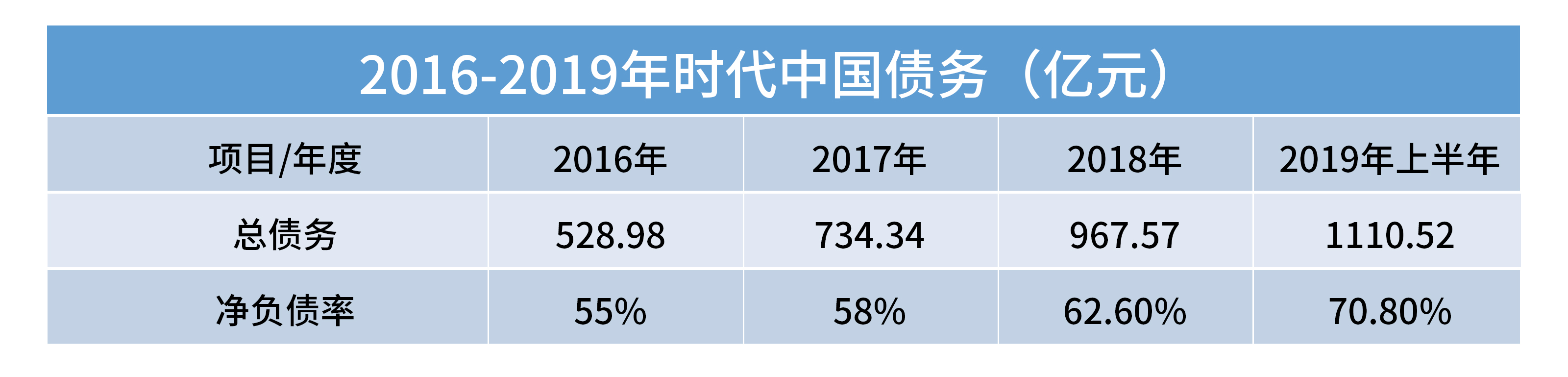 根據(jù)財報數(shù)據(jù),截至2019年6月30日,時代中國總負(fù)債突破千億元達(dá)1110.52億元,資產(chǎn)負(fù)債率則為76.37%,較上年末上升了1.4個百分點。