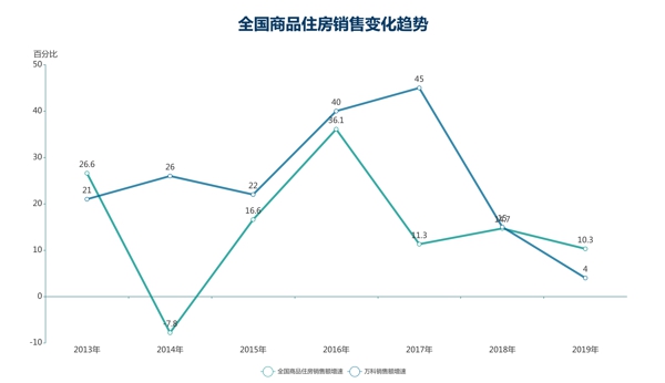 一方面,房地產(chǎn)是典型的政策性市場,行業(yè)由熱轉(zhuǎn)冷,商品房銷售增速下滑,會敏感地傳導(dǎo)至房企身上。2014-2016年期間,全國商品房銷售增速加快,萬科展現(xiàn)了更強的發(fā)展能力;而近三年全國商品房銷售增速持續(xù)放緩,萬科難以幸免,2019年增速甚至低于行業(yè)水平。