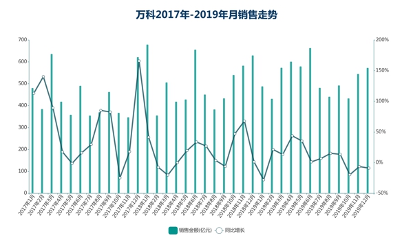 “以銷定產(chǎn)”同樣限制了土地市場上的投資,萬科在年初提出要“謹(jǐn)慎投資”,并表示投資測算預(yù)留足夠的安全邊際,保證投資質(zhì)量和合理的資源總量。據(jù)觀點新媒體統(tǒng)計,2019年萬科累計新增157個項目,同比減少84個,創(chuàng)2016年以來最低水平;新增土儲總建筑面積3872.3萬平方米,同比減少23.6%。