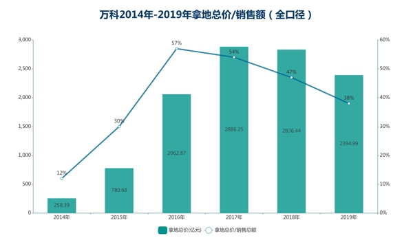 2019年,萬科拿地總價占銷售額比例約為38%,同比下降約9個百分點,同樣創(chuàng)下2016年以來最低水平。據(jù)觀點新媒體了解,過去萬科內(nèi)部認(rèn)定拿地金額占銷售金額40%左右是最佳比例。