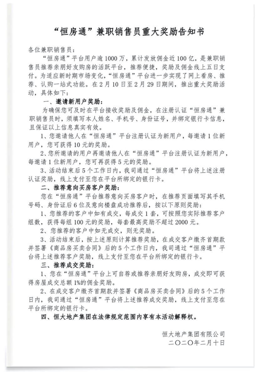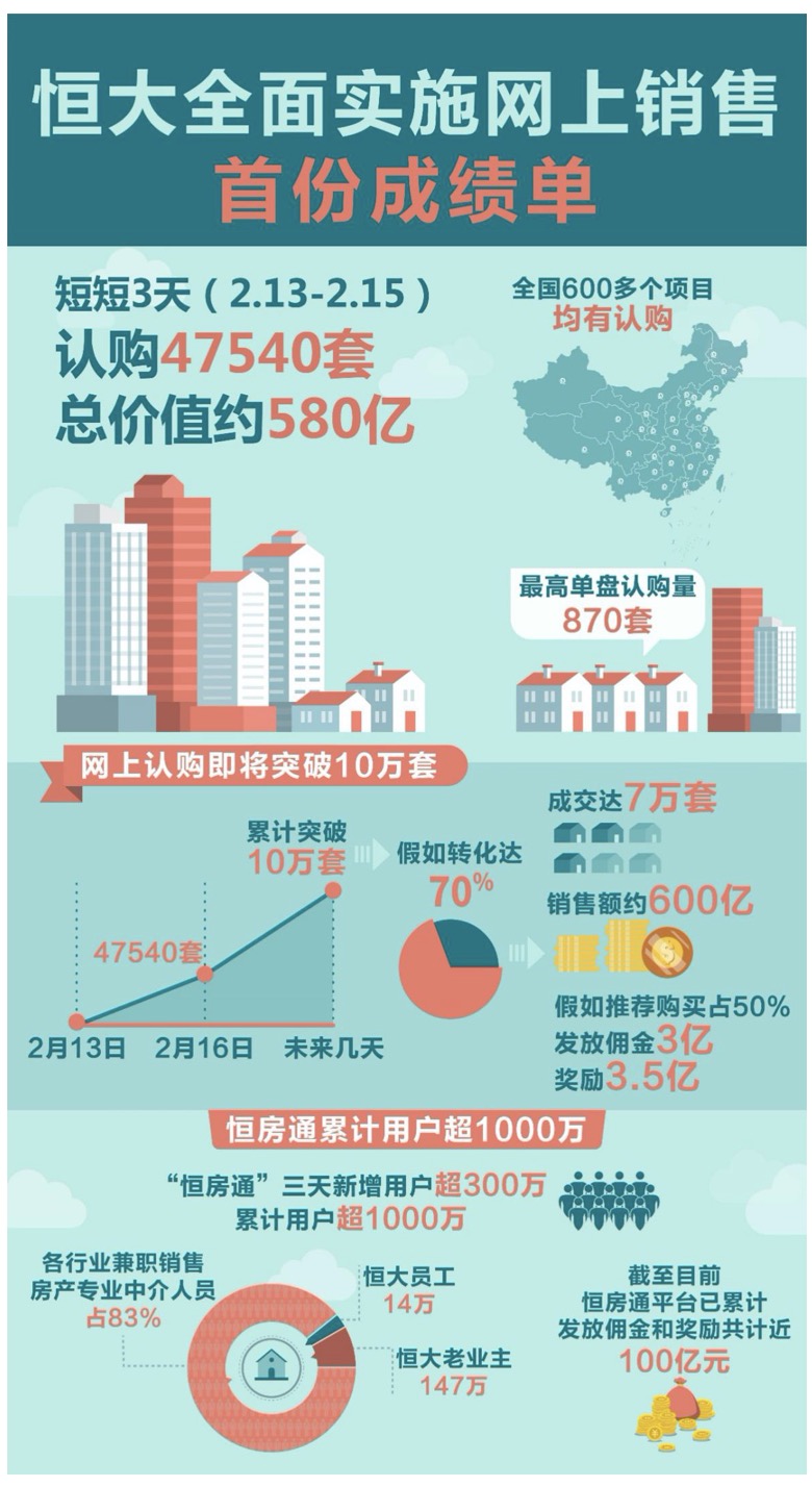 根據(jù)恒大管理層透漏,作為恒大網(wǎng)上營銷的最主要平臺,恒房通近三天新增用戶300多萬人,累計用戶超1000萬人。截至目前,恒房通平臺已累計發(fā)放傭金和獎勵近100億元,凸顯了“恒房通”對恒大業(yè)績的巨大推動作用