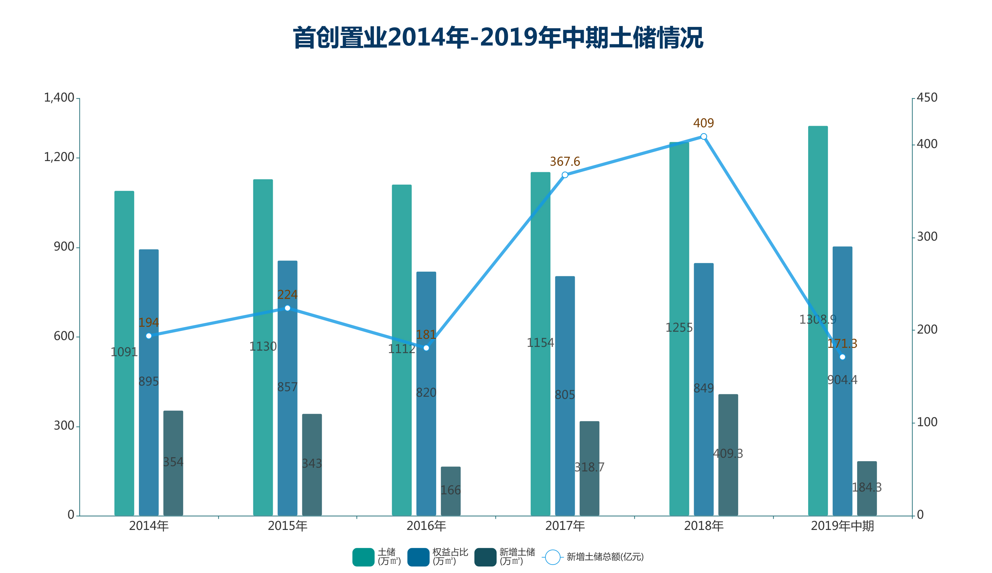 數(shù)據(jù)顯示,2019年中期,首創(chuàng)置業(yè)土儲(chǔ)面積達(dá)到歷史最高點(diǎn),為1308.9萬平方米,權(quán)益面積為904.4萬平方米。其中,2018年度斥資409億元擴(kuò)儲(chǔ)409.3萬平方米,2019年前6個(gè)月斥資171.3億元擴(kuò)儲(chǔ)184.3萬平方米,期間首進(jìn)城市包括廣州、佛山、蘇州、東莞和廈門等。