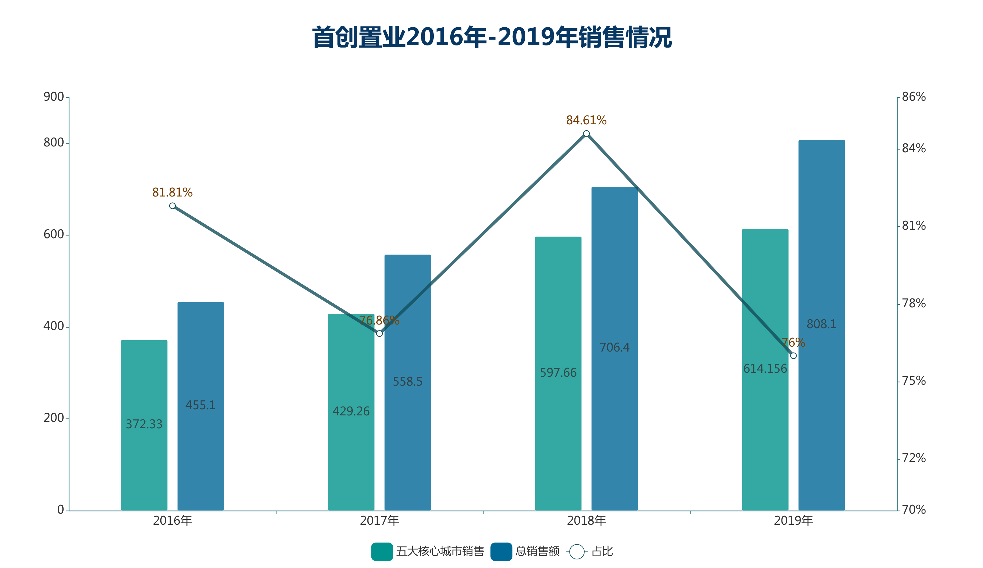反觀銷售層面,雖然布局戰(zhàn)略上轉(zhuǎn)變?yōu)?ldquo;三大城市群”,但新進(jìn)入城市銷售貢獻(xiàn)尚未得到體現(xiàn),五大核心城市仍然是首創(chuàng)置業(yè)業(yè)績(jī)主要來源。2017年至2019年,五大核心城市占總銷售金額比例分別為76.86%、84.61%、76%,三年均在此區(qū)間起伏。