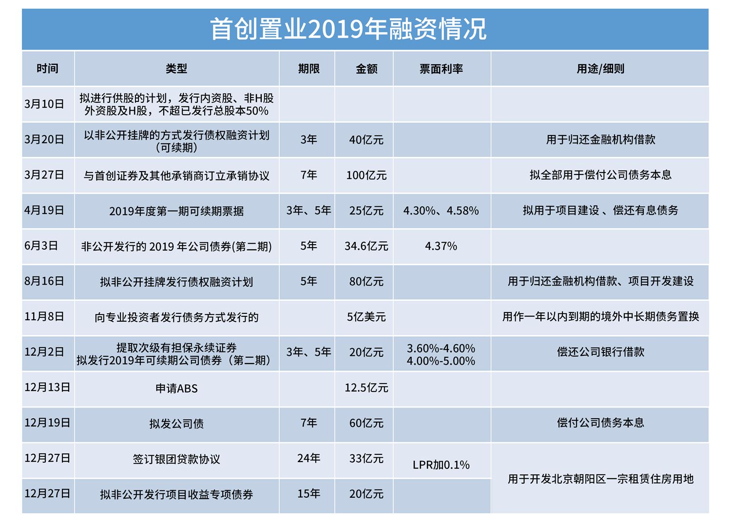 對(duì)比發(fā)現(xiàn),2019年全年,首創(chuàng)置業(yè)的融資動(dòng)作均用于償還現(xiàn)有債務(wù),以及個(gè)別用于項(xiàng)目開發(fā)建設(shè),其中不計(jì)負(fù)債、計(jì)權(quán)益的永續(xù)債是其最為主要的選擇。