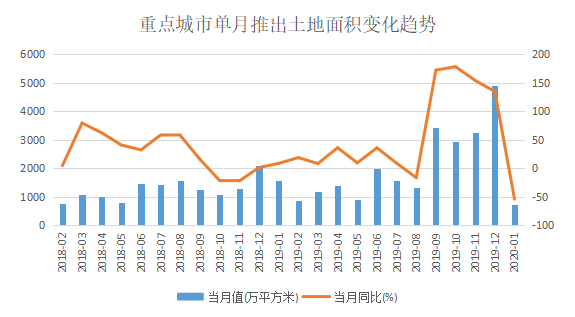 首先受到波及的便是土地推出供應(yīng)方面。以觀點指數(shù)監(jiān)測的23個重點一二城市情況來看,2020年1月單月推出土地147宗,總面積709.95萬平方米,同比減少54.56%,環(huán)比減少62.47%。