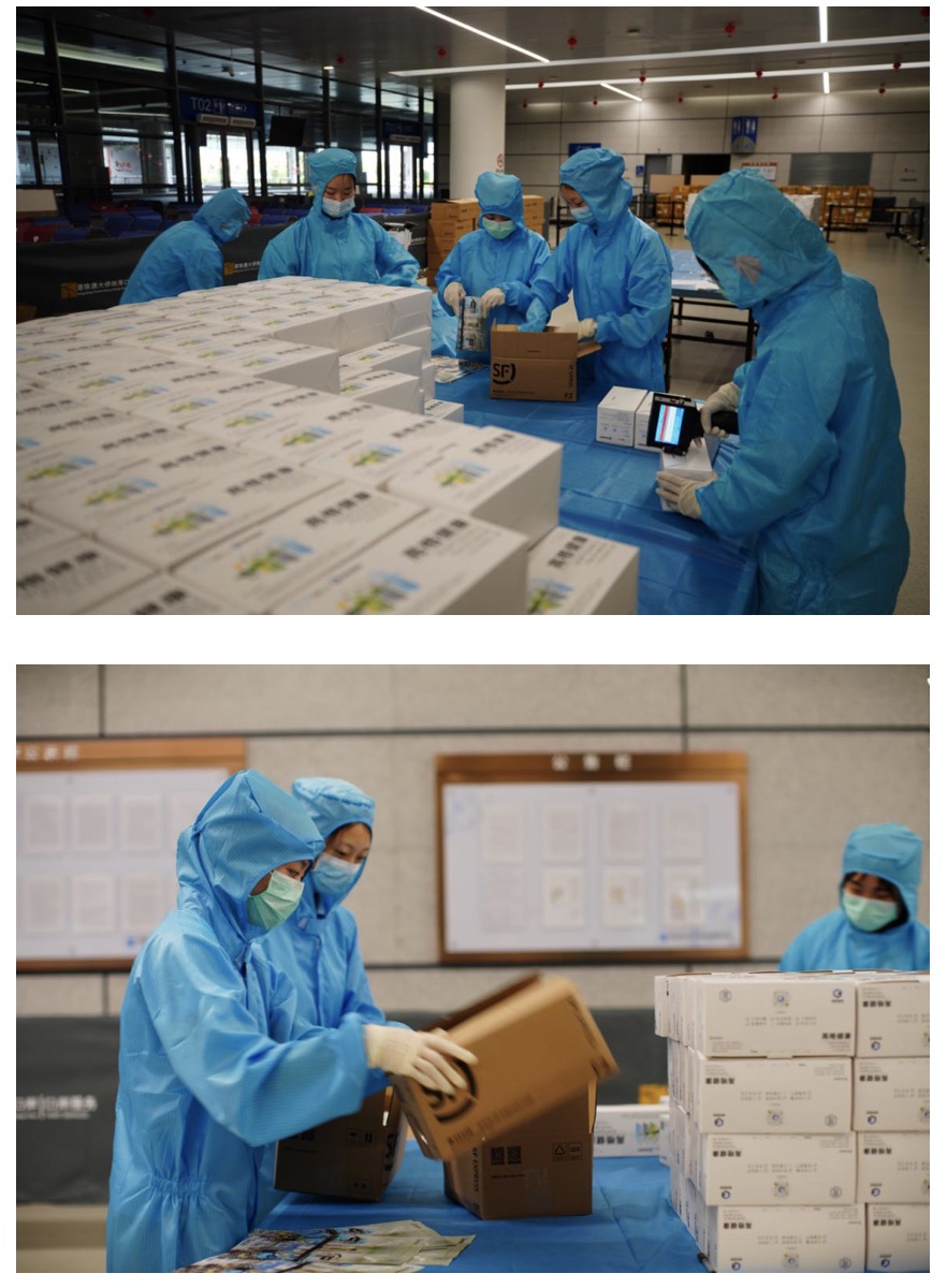 “訂單信息傳過來了,大家準備好。”11點左右,口罩后勤團隊負責(zé)人包克環(huán)興奮地舉起了手機。為了加快發(fā)貨速度,團隊提前制定了“互聯(lián)網(wǎng)+物流”方案。短短幾分鐘內(nèi),上千個訂單已在系統(tǒng)自動填寫完畢,極大提升了配送效率。