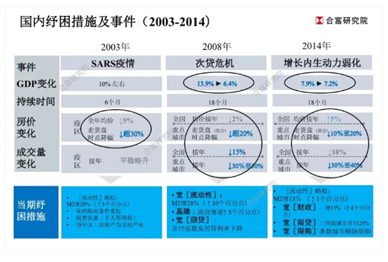 若從中國房地產(chǎn)“市場化”之后計算,在2020年以前,由2003年到2014年,國內(nèi)共有3次典型的紓困措施出臺:分別對應2003年“非典疫情”、2008年“全球次貸危機”、2014年“國內(nèi)經(jīng)濟失速”。