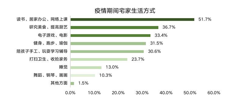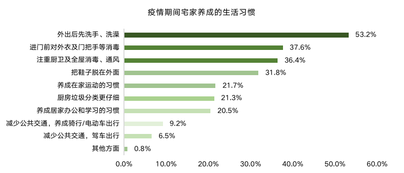 疫情期人們被動性選擇在室內的活動,少量社區(qū)內活動。室內互聯(lián)網(wǎng)和電子產品占據(jù)大部分人的時間,擁有多樣化生活方式的占比不高。室內場景豐富化,如客廳、臥室、餐廳功能多樣和場景化,是未來產品升級的重要考慮。外出生活歸家最大的改變是養(yǎng)成了勤洗手、多消毒的新習慣。