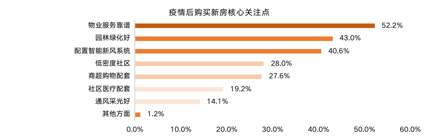 物業(yè)服務靠譜成為調查對象最多的選擇項,其次是園林綠化好和智能新風系統(tǒng)等。物業(yè)服務,從硬件到軟件的綜合提升,成為疫情后更快更好的和C端客戶交互的切入點??蛻舨粌H希望室內改善、社區(qū)配套和規(guī)劃整體升級,對物業(yè)的要求會更有所期待。在我們對不同需求層級客戶分析中,剛需客戶因為當前居住環(huán)境中物業(yè)服務多數(shù)有較大提升空間,因此關注程度更高。