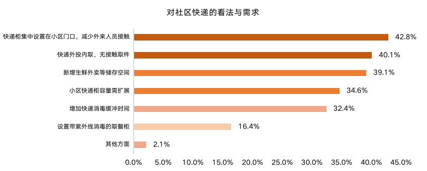 快遞收發(fā)已成為人們生活最高頻的對外接觸方式,疫情期間如何做好防控,保護在收發(fā)過程中的安全無毒成為客戶高度關注的要點,外投內取、消毒緩沖、獨立的隔離儲存空間是未來社區(qū)的提升重點。