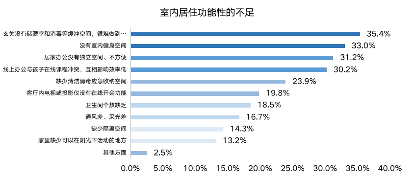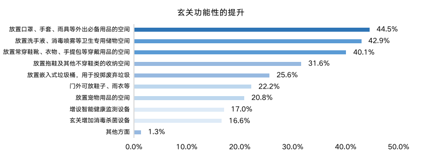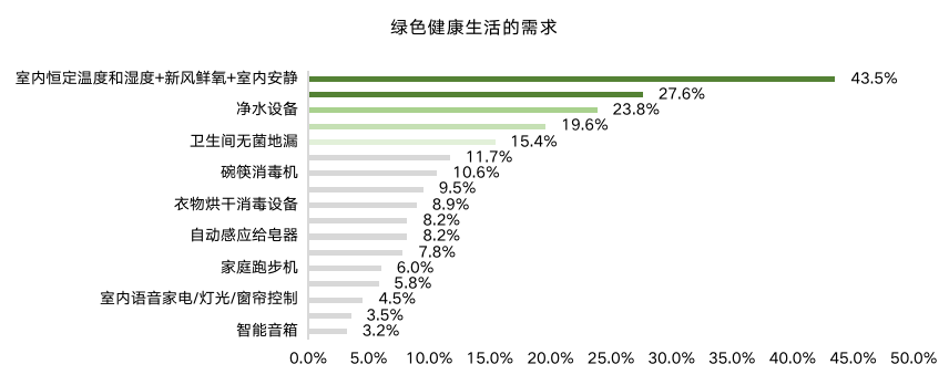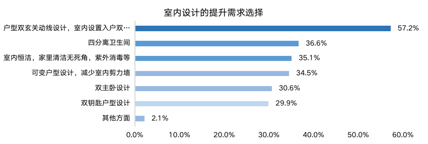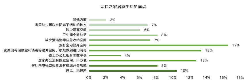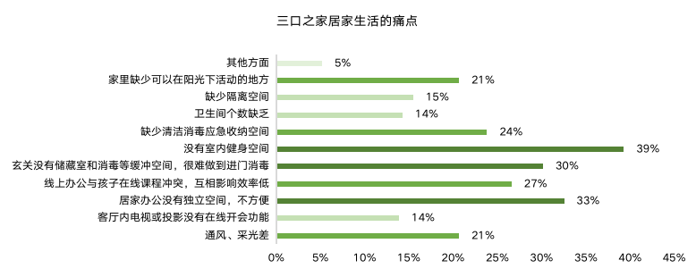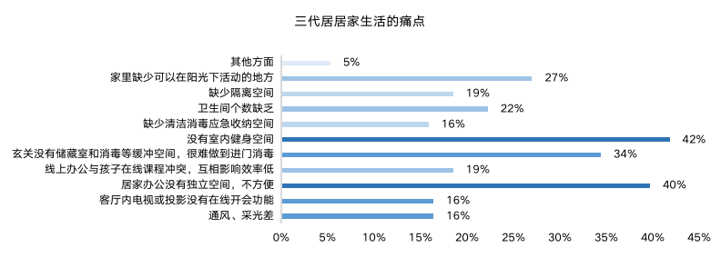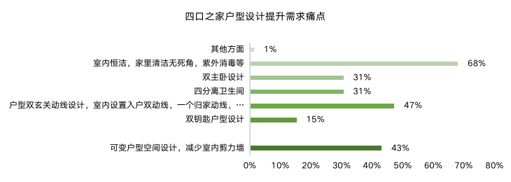 痛點傳導需求,“家庭安全消殺”、“室內健身空間”是較突出的兩大痛點體驗。加之對家人與健康的關注提高,多元功能獨立空間、玄關動線優(yōu)化、四分離衛(wèi)生間、全屋恒潔等需求成趨勢。