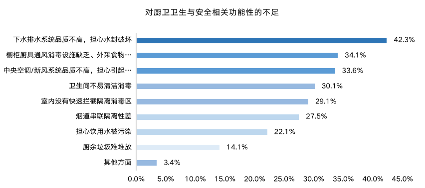 廚衛(wèi)是與家庭健康關聯(lián)度最高的區(qū)域,空間內與衛(wèi)生相關的設備設施尤為重要。下水排水系統(tǒng)不安全,擔心引起串聯(lián)污染;櫥柜廚具通風消毒設備缺乏;衛(wèi)生間設施清潔消毒性差;已經(jīng)成為高關注敏感點,并不會隨著疫情而逝去,將是長期的持續(xù)需求,衛(wèi)生層面仍要持續(xù)的關注提升。