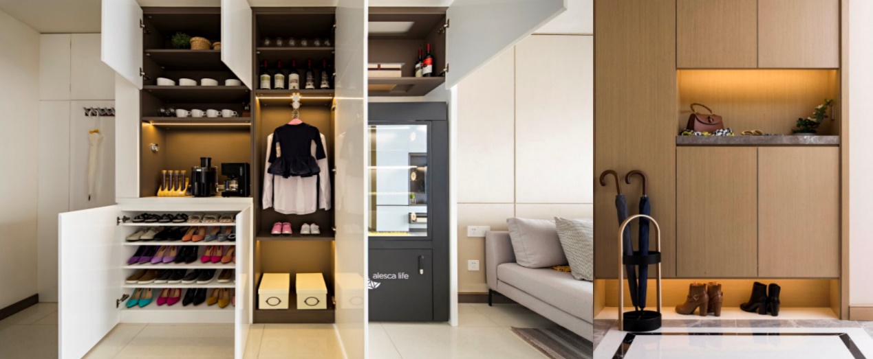 玄關過度空間是室內安全的第一道防線,重要性被突出,雙動線、玄關收納隔離區(qū),雙重衛(wèi)生與消殺設備收納,結合玄關空間,打造玄關隔離收納區(qū)域,實現(xiàn)入戶過渡、外帶物品暫存、消殺器具收納等功能。